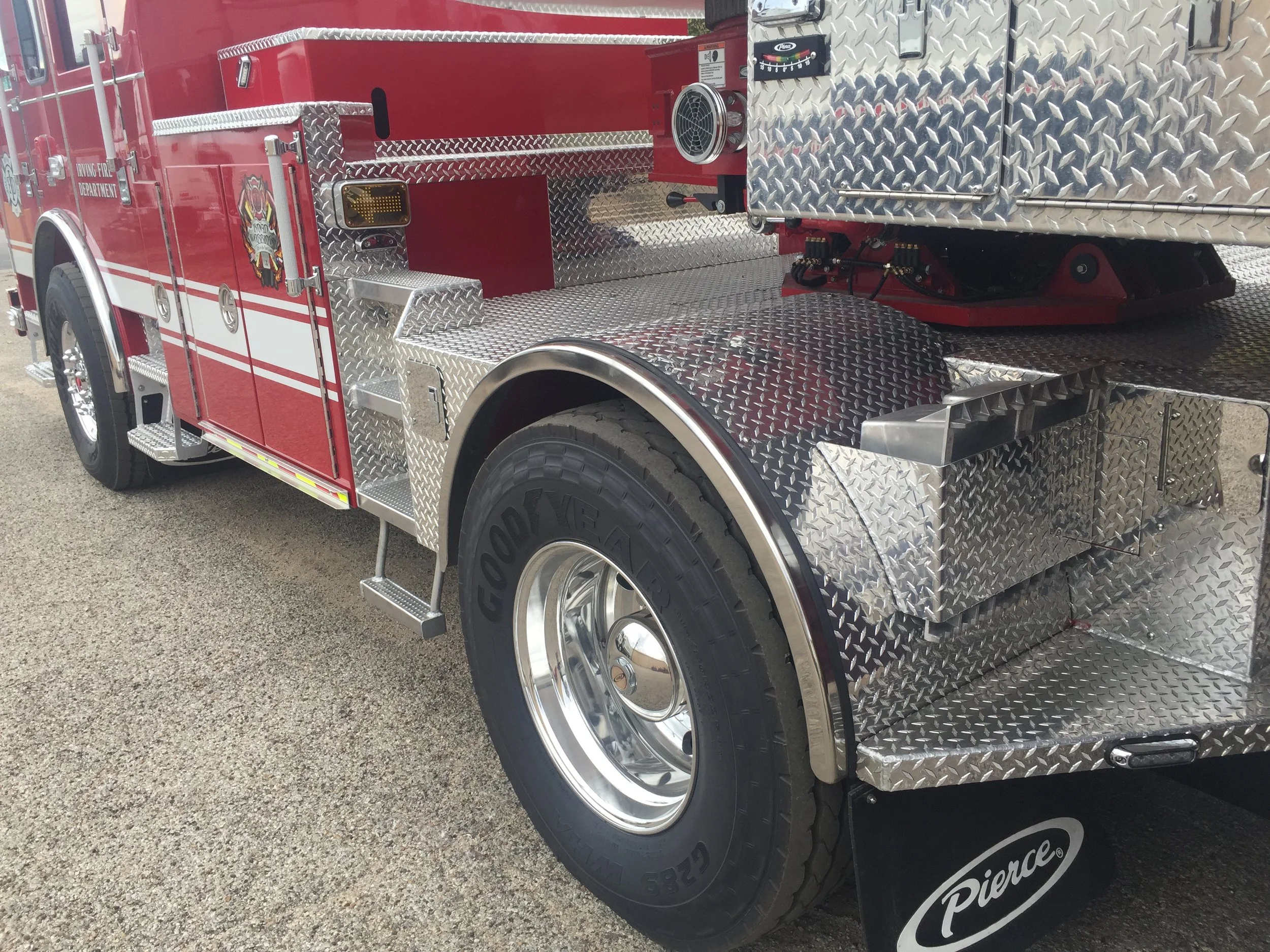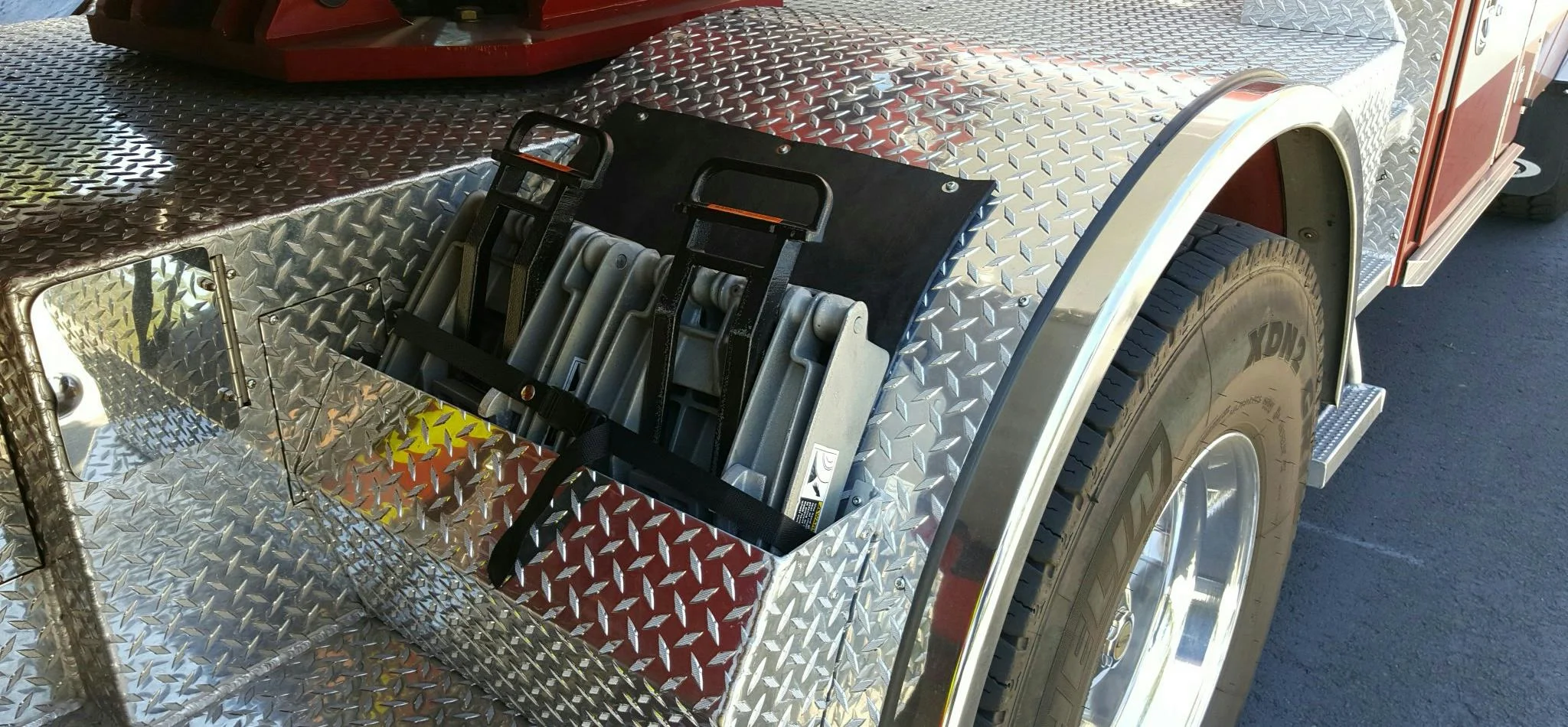 Because of the size of a tractor drawn aerial and the fact that it articulates, unique areas are available to attach tools to the outside of the apparatus. There is generally plenty of space behind the tractor and under the turntable to fasten tools or equipment such as a set of irons, New York hooks, Halligans, pump cans, battering rams, wheel chocks, traffic cones, or even a folding ladder. (Click to enlarge)